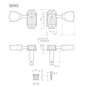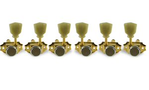Sett med 3+3 Gotoh Kluson locking mekanikk med 15:1 gear ratio for vintagegitarer med 8 mm hull i headstock og press inn bøssinger med 8,8mm utvendig diameter for 6mm bolter.